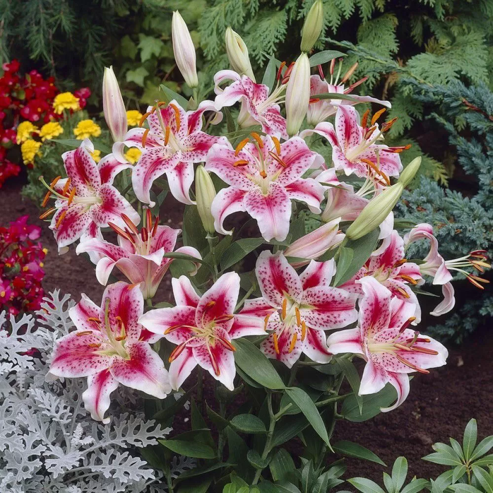 - Înălțime maturitate: Crinul Stargazer atinge o înălțime de 80 - 100 cm, oferind un aspect vertical și impunător, ideal pentru a fi plantat în fundalul grădinii sau în ghivece decorative.