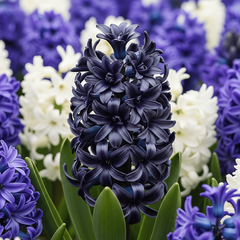 O zambilă cu flori duble de o eleganță rară și misterioasă. Petalele sale de un negru profund, ca o perlă rară, au o strălucire subtilă, ce o face să iasă în evidență într-un mod unic. Această varietate rară adaugă o notă sofisticată și dramatică în orice grădină sau spațiu interior.