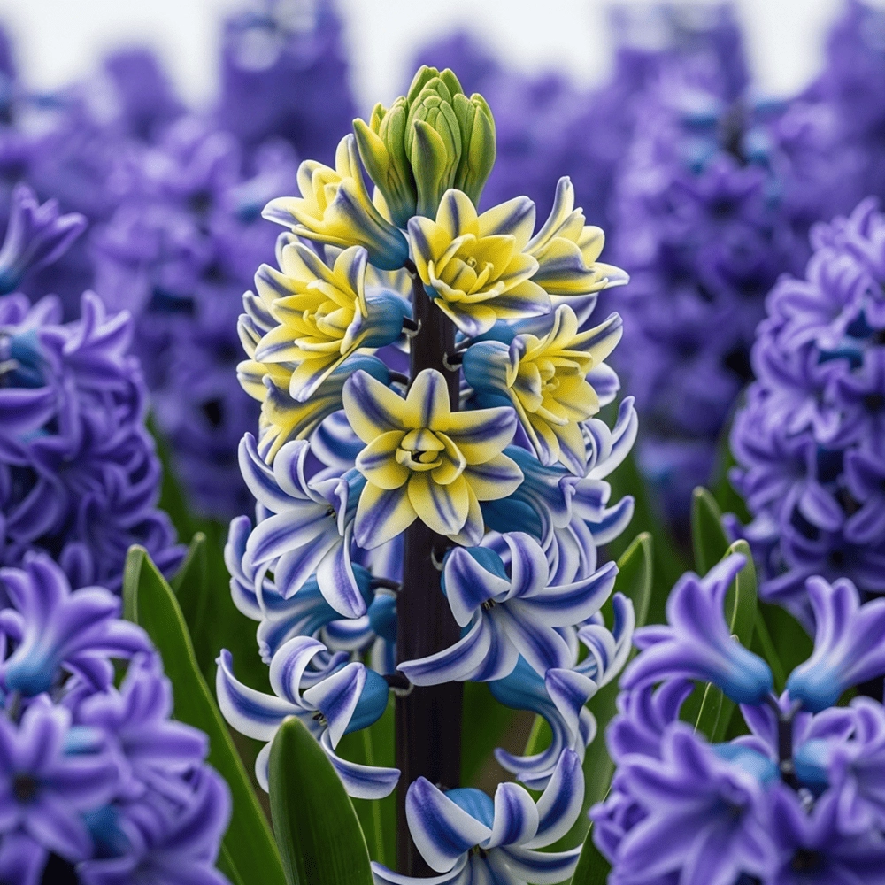 O zambilă cu flori duble de o frumusețe neconvențională, cu petale ce prezintă un model unic de striuri albastre și galbene, ca o explozie de culoare vibrantă. Această varietate plină de personalitate aduce o notă de energie și prospețime, ideală pentru a crea un accent modern și spectaculos în orice grădină sau aranjament.