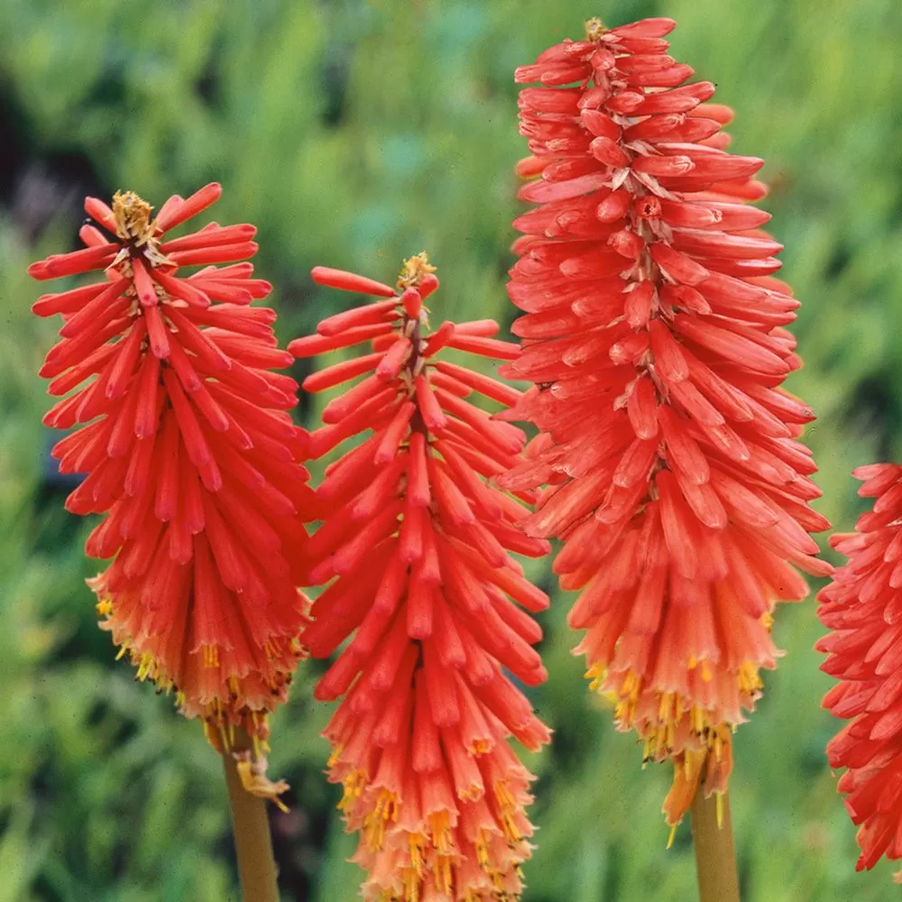 Kniphofia Red, cunoscută și sub denumirea de floarea de poker sau torța roșie, este o plantă perenă uimitoare, originară din Africa de Sud, care transformă orice grădină într-un adevărat spectacol de culori. Cu inflorescențe vibrante în nuanțe de roșu, portocaliu, galben și verde, Kniphofia poate atinge o înălțime impresionantă de până la 120 cm, aducând un impact vizual deosebit și o atmosferă exotică.