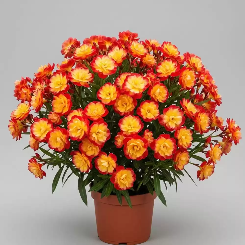 - Flori Spectaculoase Bicolore: Combinația inedită de porotcaliu șatirat cu galben conferă un aspect exotic și deosebit, transformând leandrul într-un punct focal de neuitat.